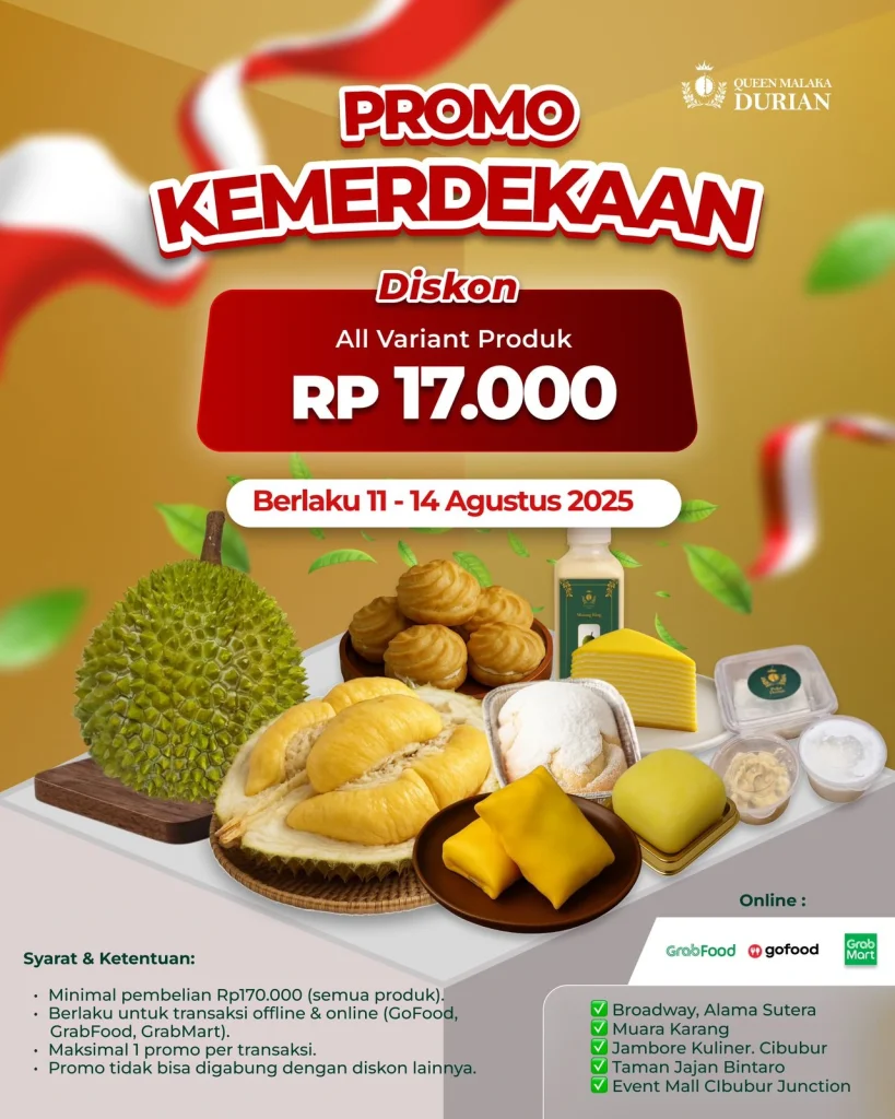 Dalam rangka memperingati Hari Kemerdekaan RI, tim Queen Malaka Durian mempersiapkan konsep dekorasi bertema merah putih di seluruh outlet. Crew outlet akan mengenakan seragam khusus bertema kemerdekaan. Selain itu, akan diadakan lomba kecil-kecilan antar pengunjung seperti tebak berat durian atau photo challenge di outlet, dengan hadiah produk gratis.